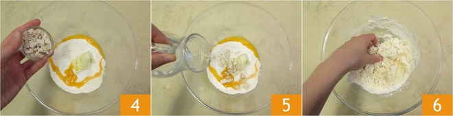 Fügen Sie auch die zerbröckelte Hefe 4 und fast das gesamte Wasser 5 hinzu. Mischen Sie, um die Zutaten zu verbinden 6. Wenn die Mischung etwas zu fest ist, können Sie das restliche Wasser hinzufügen. Arbeiten Sie den Teig nicht zu sehr, es ist nur wichtig, dass er homogen ist.