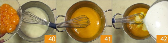 Wenn Sie eine perfekt glatte Creme erhalten haben, fügen Sie die Eigelbe hinzu 40 und mischen Sie erneut mit dem Schneebesen 41. Sobald die Milch-Sahne-Mischung zu köcheln beginnt, entfernen Sie die Schale und gießen Sie sie vollständig in die Eigelb-Mischung 42.