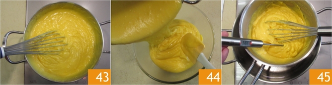 Stellen Sie den Topf wieder auf das Feuer und rühren Sie kontinuierlich, bis die Creme den ersten Siedepunkt erreicht und Streifen bildet 43. An diesem Punkt das Feuer ausschalten und die Creme in eine Schüssel gießen 44, die Sie in eine größere Schüssel mit Wasser und Eis tauchen. Während Sie darauf warten, dass sie abkühlt, gelegentlich umrühren, um zu verhindern, dass sich eine Haut auf der Oberfläche bildet; die Konsistenz sollte glatt und cremig, nicht kompakt sein 45. Sobald sie abgekühlt ist, füllen Sie die Konditorcreme in einen Spritzbeutel ohne Tülle und stellen Sie sie in den Kühlschrank.