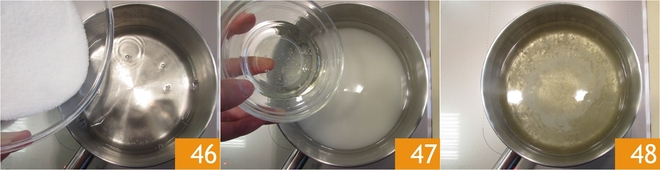 Um den Sirup vorzubereiten, geben Sie das Wasser zusammen mit dem Zucker 46 und dem Glukosesirup 47 in einen Topf. Wenn der Sirup Blasen bildet, rühren Sie um und warten Sie, bis er voll kocht 48. An diesem Punkt schalten Sie aus und nehmen Sie den Topf vom Feuer, um zu verhindern, dass der Wasseranteil verdunstet.