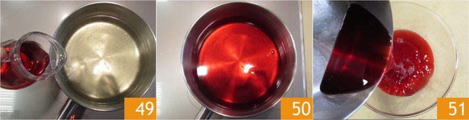 Sobald der Sirup Raumtemperatur erreicht hat, fügen Sie den Alchermes hinzu 49 und mischen Sie 50. Zum Zeitpunkt der Verwendung sollte der Sirup eine Temperatur zwischen 30 °C und 35 °C haben, also erwärmen Sie ihn leicht und gießen Sie ihn in eine Schüssel 51.