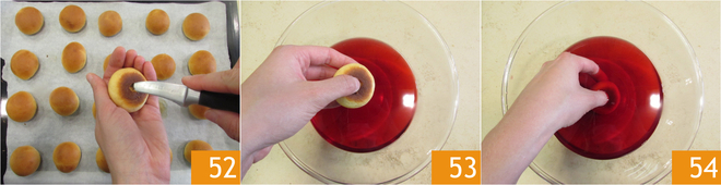 Nehmen Sie die inzwischen abgekühlten Halbkugeln und schneiden Sie mit der Spitze eines kleinen Messers an der Basis einen Schlitz 52. Dann stecken Sie den Daumen in die Öffnung, um sie leicht zu vergrößern 53, und tauchen Sie sie in den Sirup 54. Sie können überprüfen, ob Sie 12 g Alchermes pro Halbkugel hinzugefügt haben, indem Sie sie nach dem Eintauchen auf der Waage wiegen.