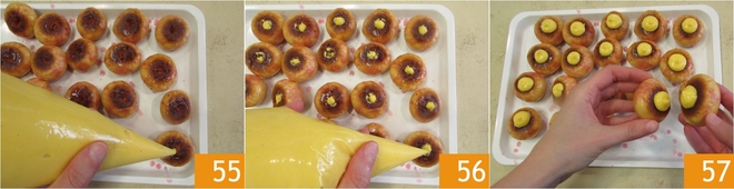 Wenn alle eingetaucht sind, geben Sie etwa 6 g Konditorcreme in die Öffnung jeder Halbkugel 55, fügen Sie dann weitere 6 g auf der Oberfläche hinzu, für insgesamt 12 g pro Stück 56. Schließlich paaren Sie die Halbkugeln zu zweit, so dass die Basis übereinstimmt und etwas Creme von den Seiten austritt 57.