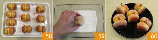 Wenn alle fertig sind 58, rollen Sie die Pfirsiche im Kristallzucker, nur an den Seiten 59 bedeckend. Dekorieren Sie Ihre Prateser Pfirsiche mit einem Stück kandierter Orangenschale, als ob es der Stiel wäre 60!