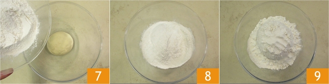 Formen Sie eine Kugel und bedecken Sie sie mit den 375 g Mehl, die für den zweiten Teig benötigt werden 7, und lassen Sie sie dann 1-1,5 Stunden gehen 8; auf diese Weise bildet sich keine Haut auf der Oberfläche. Während der Gehzeit sollte das Biga fast das dreifache Volumen erreichen 9.