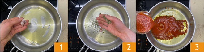Um die Provola nach Pizzaiola-Art zuzubereiten, beginnt mit der Sauce: Erhitzt etwas Öl mit einer Knoblauchzehe 1 und dem Oregano 2, dann gebt die Tomatenpassata hinzu 3.