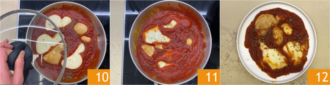 Deckt wieder mit dem Deckel ab 10 und lasst bei ganz schwacher Hitze etwa 3–5 Minuten weitergaren, ohne umzurühren. Die Provola soll schmelzen, ohne zu zerreißen 11. Serviert eure Provola nach Pizzaiola-Art sofort und garniert sie nach Belieben mit weiterem Oregano 12!