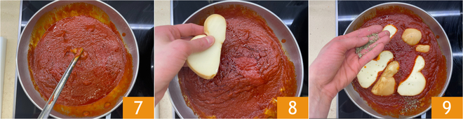 Nach der Kochzeit entfernt den Knoblauch 7 und legt die Provolascheiben in die Sauce 8, dann gebt noch etwas Oregano dazu 9.