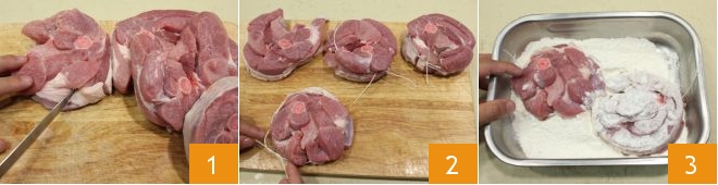 Um das Puten-Ossobuco mit Risotto zuzubereiten, bereiten Sie das Puten-Ossobuco vor: Schneiden Sie mit einem Messer die Membran ein, die das Ossobuco umgibt 1, dies verhindert, dass sich das Ossobuco während des Kochens "krümmt", umwickeln Sie es mit Küchengarn 2, mehlen Sie die vier Ossobuco von beiden Seiten 3 und legen Sie sie beiseite in eine Schüssel.