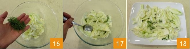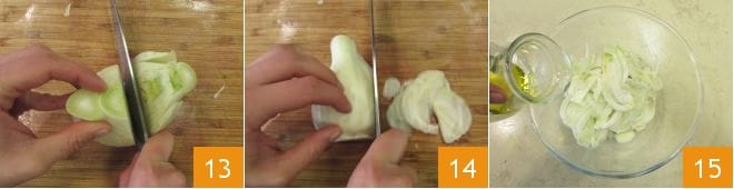 In zwei Hälften teilen und dann fein schneiden (13-14), dann in eine Schüssel geben und mit 30 g Öl 15, Salz und Pfeffer würzen.