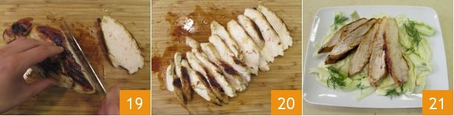 Nehmen Sie die Pute, schneiden Sie sie in ungefähr 1 cm dicke Scheiben (19-20) und verteilen Sie sie auf dem Fenchelbett 21.