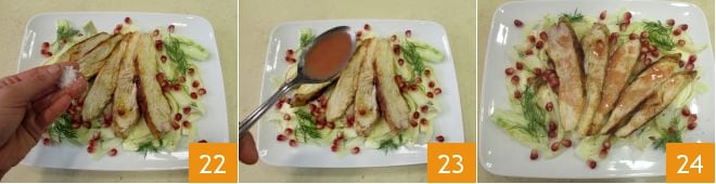 Garnieren Sie mit den zurückbehaltenen Granatapfelkernen, den Salzflocken 22 und beträufeln Sie mit der Granatapfel-Öl-Emulsion 23; die Putenbruststreifen mit Fenchel und Granatapfel sind servierbereit 24.