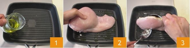 Um die Putenbruststreifen mit Fenchel und Granatapfel zuzubereiten, beginnen Sie mit dem Fleisch. Gießen Sie ein wenig Öl auf eine heiße Grillplatte 1. Legen Sie die Pute darauf 2 und braten Sie sie auf mittlerer Hitze von einer Seite etwa 25 Minuten. Nach den ersten 25 Minuten wenden Sie das Fleisch 3