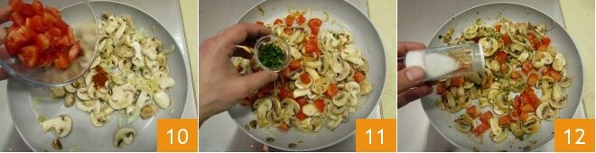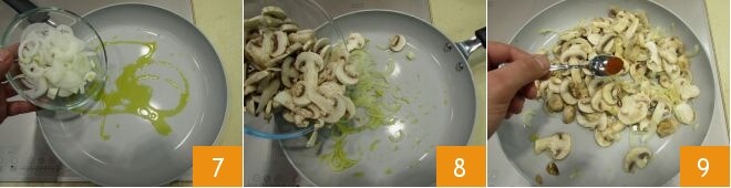 und die Zwiebel für 5 Minuten dünsten 7. Die Pilze dazugeben und weitere 5 Minuten kochen 8, dann das Chilipulver hinzufügen 9.