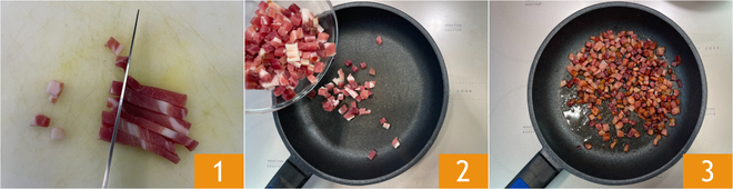 Um den Risotto mit Radicchio und Speck zuzubereiten, bereiten Sie zuerst die Gemüsebrühe zu und halten Sie sie warm. Schneiden Sie den Speck in Würfel 1 und geben Sie ihn in eine Pfanne mit einem Schuss Öl 2. Braten Sie den Speck etwa 6 Minuten lang an, bis er knusprig wird 3.