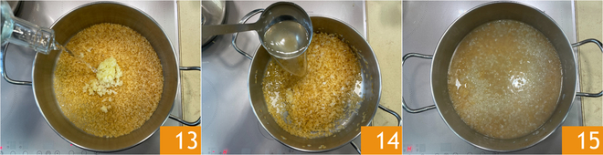 Geben Sie den Reis in einen großen Topf 10 und rösten Sie ihn für ein paar Minuten unter häufigem Rühren 11. Fügen Sie die gedünstete Zwiebel hinzu 12 und rühren Sie um.
