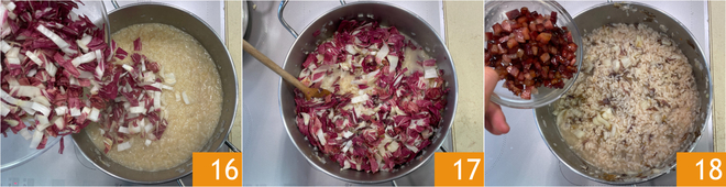 Wenn noch etwa 6 Minuten bis zum Ende der Garzeit des Reises fehlen, fügen Sie den Radicchio hinzu 16 und rühren Sie gut um 17. Sobald der Risotto gar ist, schalten Sie die Hitze aus und geben Sie den Speck hinzu 18.