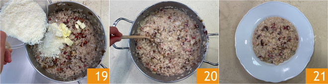 Zum Schluss mit Butter und geriebenem Parmigiano Reggiano DOP verfeinern 19, umrühren 20 und Ihren Risotto mit Radicchio und Speck servieren 21!