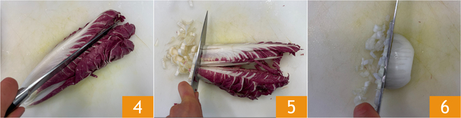 Stellen Sie den Speck beiseite und schneiden Sie den Radicchio in der Mitte 4 und dann in kleine Stücke 5. Beiseite legen und die Zwiebel hacken 6.