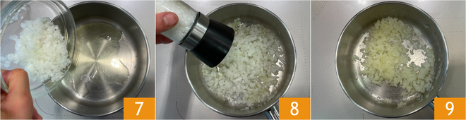 Geben Sie die Zwiebel in einen kleinen Topf mit einem Schuss Öl 7, fügen Sie Salz hinzu 8 und dünsten Sie sie bei schwacher Hitze. Sobald sie weich ist, die Zwiebel beiseite stellen 9.