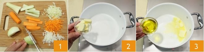 Um das Schweinefleischragout zuzubereiten, bereiten Sie die Fleischbrühe zu. Dann machen Sie sich an das Soffritto: Schälen und hacken Sie fein Karotte, Sellerie und Zwiebel 1. In einen Topf geben Sie die Butter 2 und lassen Sie bei niedrigster Hitze schmelzen, dann fügen Sie das Öl hinzu 3 und lassen es wenige Augenblicke erhitzen.