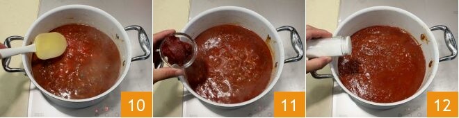 vermischen Sie 10 und lassen Sie es einige Minuten einziehen. Wenn das Ragout wieder zu köcheln beginnt, fügen Sie auch das Tomatenmark hinzu 11, vermischen Sie es mit dem Ragout, salzen Sie 12