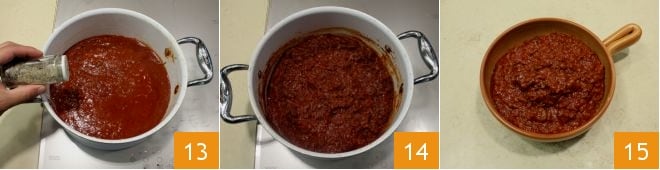 und pfeffern Sie 13 nach Belieben und lassen Sie alles bei niedriger Hitze etwa 3 Stunden köcheln (Sie können einen Spritzschutz verwenden, um es ohne Deckel köcheln zu lassen) oder solange, bis es eindickt 14. Wenn das Schweinefleischragout fertig ist, können Sie es bei Bedarf salzen und als Belag für Pastagerichte oder Lasagnen verwenden 15.