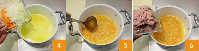 Dann fügen Sie das fein gehackte Gemüse hinzu 4. Lassen Sie die Zwiebel anschwitzen und bräunen, fügen Sie 1-2 Kellen Fleischbrühe hinzu, um das Garen zu erleichtern 5. Nach etwa 15 Minuten geben Sie das Hackfleisch hinzu 6