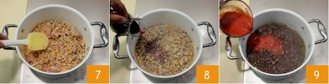 und lassen es etwa zehn Minuten gut anbraten, indem Sie es mit einem Spatel 7 oder einem Holzlöffel zerbröseln. Fügen Sie etwas Gemüsebrühe hinzu, dann den Rotwein 8 und lassen ihn bei mäßiger Hitze verdampfen. Wenn der Wein verdampft ist, fügen Sie das Passata hinzu 9,