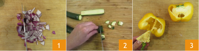 Für die Zubereitung der Tarte kümmert ihr euch zuerst um das Gemüse. Wascht es gründlich. Die Zwiebel schälen, in Scheiben schneiden und grob hacken 1. Bei der Zucchini die Enden abschneiden, zuerst längs halbieren und dann in Würfel schneiden 2. Jetzt die gelbe Paprika halbieren, die Kerne und die inneren Häutchen entfernen 3.