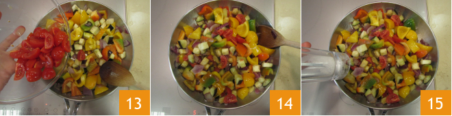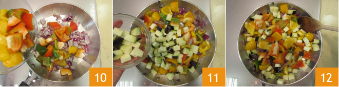 Gebt nun die Paprika in die Pfanne 10, dann die Zucchini und die Auberginen 11. Alles gut vermengen und ein paar Minuten weitergaren 12.