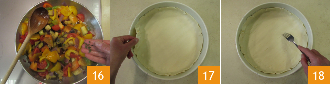 und fügt die Thymianblättchen hinzu 16. Weitere 5 Minuten bei starker Hitze garen. Das Gemüse sollte noch bissfest sein. Schaltet dann die Hitze aus und lasst alles mindestens 10 Minuten abkühlen. Rollt den Blätterteig vorsichtig aus und legt ihn in eine Form mit 28 cm Durchmesser 17. Die Bodenfläche mit einer Gabel mehrmals einstechen 18