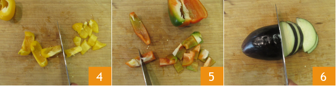 Schneidet sie zuerst in Streifen und dann in etwa 2 cm große Stücke 4. Dasselbe macht ihr mit der roten Paprika 5. Nehmt eine Aubergine, entfernt die Enden und schneidet sie zunächst in Scheiben 6