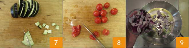 und dann in Würfel 7. Die Cocktailtomaten vierteln 8. Gebt etwas Öl in einen Topf, fügt die Zwiebel hinzu und lasst sie ein paar Minuten anschwitzen 9.