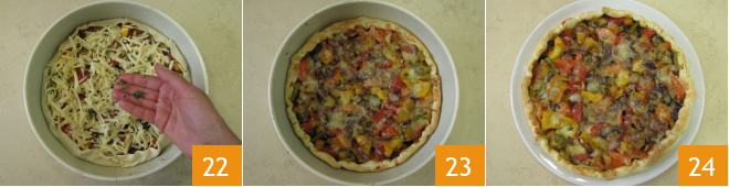 und gebt das inzwischen abgekühlte Gemüse hinein 19. Streut den geriebenen Edamer mit der groben Seite der Reibe darüber 20 und klappt den überstehenden Rand des Teigs nach innen auf die Füllung 21.