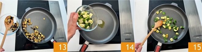 Wenn sie gleichmäßig gebräunt sind, dies dauert etwa 8 Minuten, geben Sie sie in eine kleine Schüssel 13. Geben Sie in dieselbe Pfanne einen Schuss Öl und fügen Sie die Zucchini hinzu 14. Fügen Sie eine Prise Salz hinzu und kochen Sie sie 5-6 Minuten lang 15.