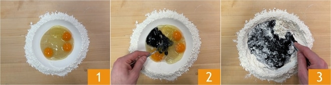 Um die Ravioli mit Sepiatinte zuzubereiten, beginnen Sie mit dem frischen Eiernudelteig: Geben Sie das Mehl auf das Nudelbrett, formen Sie eine Mulde in der Mitte und geben Sie die Eier hinein 1. Fügen Sie die Sepiatinte hinzu und mischen Sie mit einer Gabel 2, um das gesamte Mehl zu integrieren 3.