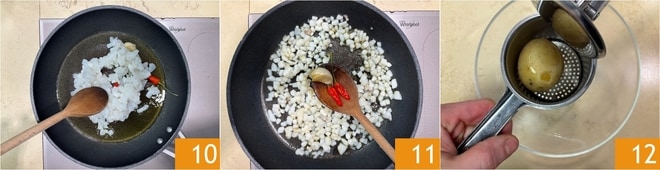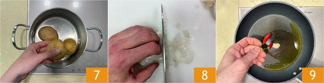 Kümmern Sie sich um die Füllung: Kochen Sie die Kartoffeln in kochendem Wasser etwa 30 Minuten lang, oder bis sie weich sind. Schneiden Sie den gereinigten Sepia in kleine Würfel 8. Erhitzen Sie in einer Pfanne einen Schuss Öl mit Knoblauch und Chili 9.