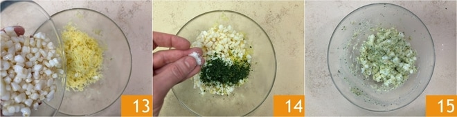 Geben Sie den gekochten Sepia in dieselbe Schüssel, in der Sie das Kartoffelpüree gesammelt haben 13, und würzen Sie dann mit gehackter Petersilie, einer Prise Salz und Pfeffer 14. Mischen Sie, um alles zu vermengen, und lassen Sie es 10 Minuten im Kühlschrank ruhen 15.