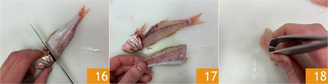Reinigen Sie die Rotbarben: Entfernen Sie den Kopf 16, schneiden Sie die Filets heraus 7 und entfernen Sie die Gräten 18.