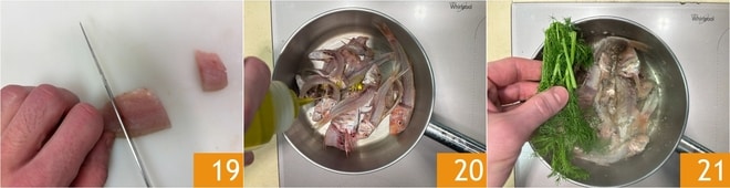 Schneiden Sie die gereinigten Filets in Rauten 19 und salzen Sie sie. Geben Sie die Reste der Rotbarben in einen Topf, fügen Sie einen Schuss Öl hinzu und rösten Sie sie etwa 4 Minuten 20. Aromatisieren Sie mit Majoran und wildem Fenchel 21.