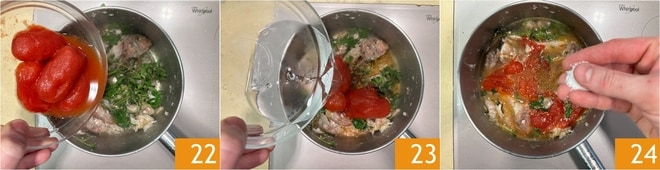 Fügen Sie die geschälten Tomaten hinzu 22, ein Glas Wasser 23, salzen 24 und pfeffern. Kochen Sie 20 Minuten und rühren Sie gelegentlich um.