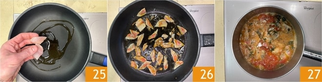 Erhitzen Sie in der Zwischenzeit einen Schuss Öl in einer Pfanne und legen Sie die Rotbarben mit der Hautseite nach unten hinein 25. Wenn die Haut gut gebräunt ist, drehen Sie sie um und schließen Sie das Kochen ab 26. Zu diesem Zeitpunkt ist der Guazzetto fertig 27.
