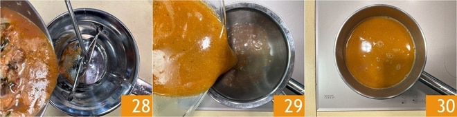 Passieren Sie den Guazzetto durch die Flotten Lotte 28, dann seihen Sie die Mischung durch ein Sieb 29 und geben Sie die gewonnene Soße in einen kleinen Topf. Lassen Sie den Guazzetto etwa 20 Minuten reduzieren.