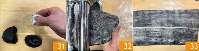 Nehmen Sie den Teigballen, teilen Sie ihn in kleinere Portionen und arbeiten Sie jeweils eine, während Sie die anderen mit Frischhaltefolie abgedeckt lassen, um ein Austrocknen zu verhindern. Bestäuben Sie die erste Portion Teig mit Mehl 31, dann lassen Sie sie durch die Nudelmaschine, um sie zu verdünnen 32, beginnend mit der größten Dicke, bis Sie Blätter mit einer Dicke von etwa 2 mm erhalten 33.