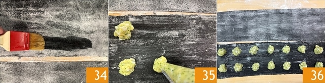 Befeuchten Sie ein Teigblatt, indem Sie es mit Wasser bestreichen 34, dann drücken Sie kleine Portionen der Füllung mit ausreichendem Abstand aus; Sie können einen Spritzbeutel oder 2 Löffel verwenden 35 36.