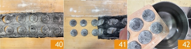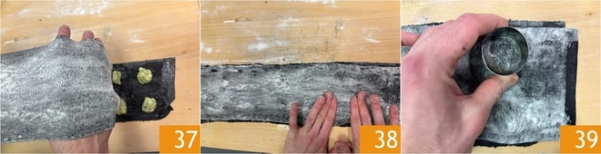 Bedecken Sie mit einem weiteren Teigblatt 37, drücken Sie es gut an den Rändern um die Füllung 38; Wenn Sie einen kleineren Ausstecher haben, können Sie ihn verwenden, um die Form zu definieren und die Luft aus der Füllung zu entfernen. Schneiden Sie die Ravioli mit einem Ausstecher mit einem Durchmesser von 5 cm aus 39.
