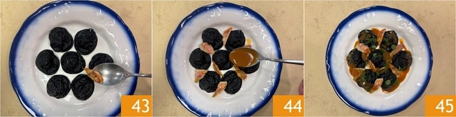 Nach dem Abgießen richten Sie die Ravioli mit den gebräunten Rotbarbenfilets an 43, dem Fischguazzetto 44, den Majoranblättern und dem Fenchel. Die Ravioli mit Sepiatinte sind bereit zum Servieren 45!