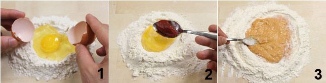Um die roten Ravioli mit Tomate zuzubereiten, legen Sie das Mehl auf ein Backbrett in Form eines Brunnens und geben Sie die Eier 1 und das Tomatenmark 2 in die Mitte. Mischen Sie mit einer Gabel, indem Sie das Mehl nach und nach einarbeiten 3.