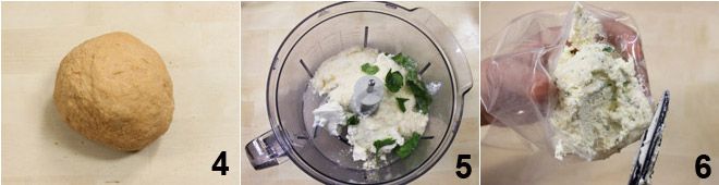 Kneten Sie die Mischung mit den Händen, bis Sie einen glatten und elastischen Teig erhalten 4. Decken Sie den Teig mit Frischhaltefolie ab und lassen Sie ihn mindestens 30 Minuten im Kühlschrank ruhen. In der Zwischenzeit bereiten Sie die Füllung der roten Ravioli mit Tomate vor: Geben Sie in eine Küchenmaschine Ricotta, geriebenen Käse und zerkleinertes Basilikum 5, würzen Sie mit Salz und Pfeffer und schalten Sie die Küchenmaschine ein, bis die Zutaten vermischt sind. Dann geben Sie die Mischung in einen Spritzbeutel 6.
